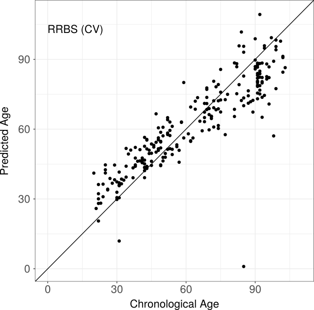 Similarly, the training data set consisted of 1,866 samples from 20 studies, either from GEO or TCGA, and contained ages between 0 and 103 years. In addition to the majority of blood samples, kidney and brain tissues were included. An independent test data set comprising 1,007 mainly blood samples was used to evaluate performance of the pre-defined predictor, which selected 761 age-associated CpGs. In line with the findings for its predecessor chip, cross validation proved high predictive performance (correlation 0.95, MADiff 2.8 years) underpinned by the independent test data set (0.89 and 2.94 years).