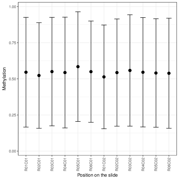 The following figure visualizes the average methylation per sample. Samples are grouped by slide.