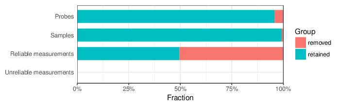 As a final outcome of the filtering procedures, 13322 probes and 0 samples were removed (124 samples and 451578 probes were retained). These statistics are presented in a dedicated table that accompanies this report and visualized in the figure below.