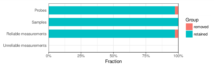 As a final outcome of the filtering procedures, 46473 probes and 0 samples were removed (792 samples and 439104 probes were retained). These statistics are presented in a dedicated table that accompanies this report and visualized in the figure below.