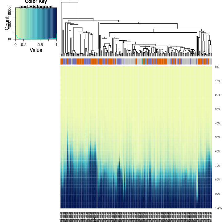 Hierarchical clustering of samples based on all methylation values. The heatmap displays methylation percentiles per sample. The legend for sample coloring can be found in the figure below.
